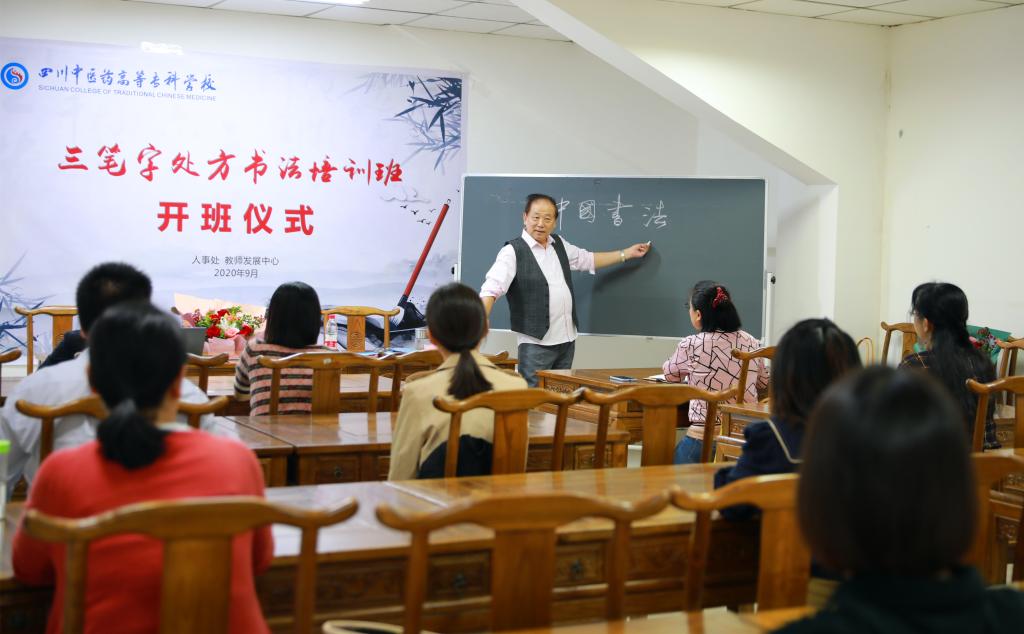 9月16日,我校三笔字处方书法培训班开班,校长王飞、校党委副书记代红英,四川省教育学会会长刘东、全国优秀社科普及专家张旭农教授及其教学团队等参加开班仪式。